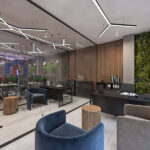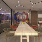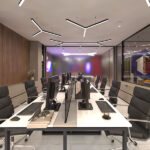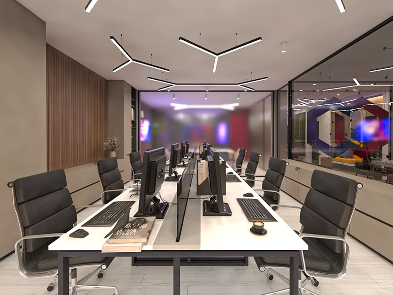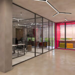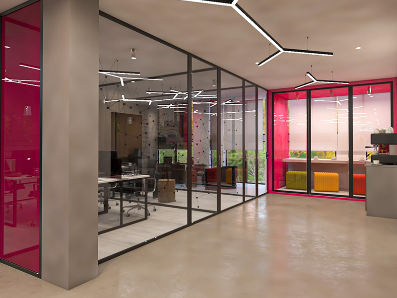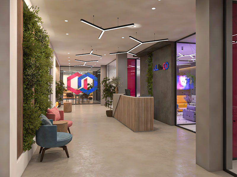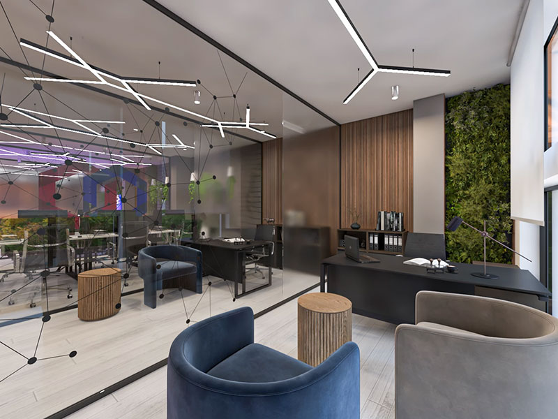 دفتر اداری شرکت مشاوره و تامین آسان مواد شیمیایی صنایع متاسان در دو طبقه مجزا با متراژ 600 متر مربع اجرا و تجهیز شد. در اجرای این دفتر برای تفکیک فضا به بخش های کوچک تر از پارتیشن های شیشه ای استفاده شد. پارتیشن های شیشه ای در کنار مدرن سازی فضا، نور را به خوبی عبور داده و به روشن شدن فضا کمک کردند. همچنین در طراحی دکوراسیون این دفتر ترمو وال و دیوار سبز به کار گرفته شد که باعث زیبایی بیشتر محیط شد. در سقف طبقه دوم سازه های فلزی با رنگ مشکی کار شد. برای روشنایی فضا از چراغ های آویز مدرن با اشکال خاص، چراغ های سقفی و چراغ های اسپات استفاده شد.