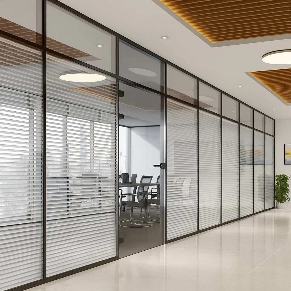 پارتیشن دوجداره آلومینیوم و شیشه سکوریت با پرده کرکره ای